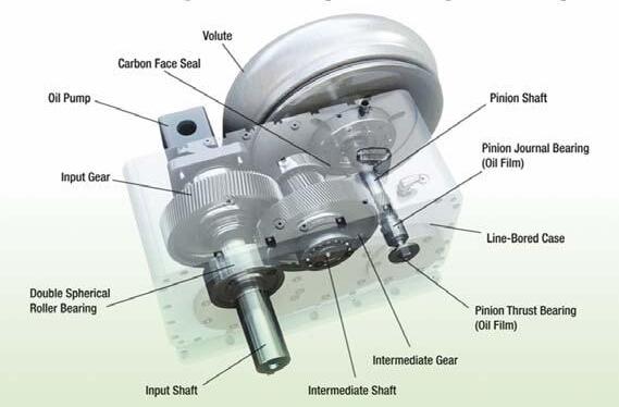 The combination of the increasing speed gears or belt drives with a standard VFD is probably the most important element of the low-speed blower. The shaft speed of the motor driver is connected to an increasing speed gearbox (and, in some cases, a belt assembly as well) to achieve high-speed output to drive the blower impeller and achieve high-speed turbo efficiencies when compressing air. This results in the simplification of the design by not requiring inlet guide vanes and diffuser vanes for flow