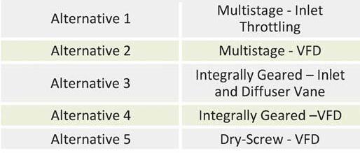 The capital cost of the multistage centrifugal with inlet throttling is the secondleast expensive option at $169,051-$404,189, with a mean value of $282,937. The capital cost of the dry screw technology is the leastexpensive option at $145,981-$336,873, with a mean value of $238,001, which represents a savings of 14 to 17 percent (16 percent). The other three alternatives all have higher capital costs than dry screw and multistage with inlet throttling.