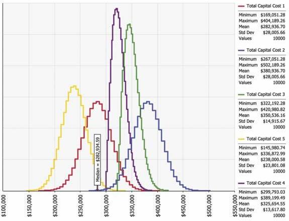 All the proposed alternatives were compared from the financial standpoint of life cycle costs. Given the large number of input variables required to predict total cost, capital expenditures (CAPEX), and operating expenses (OPEX), a probabilistic sensitivity analysis was performed. In this evaluation, each of the main variables affecting the total cost of each alternative (CAPEX + OPEX) was assigned a probability function specific to the variable. Then, a Monte Carlo-type simulation (with over 10,000 iterations) was run for each of the Continued on page 8