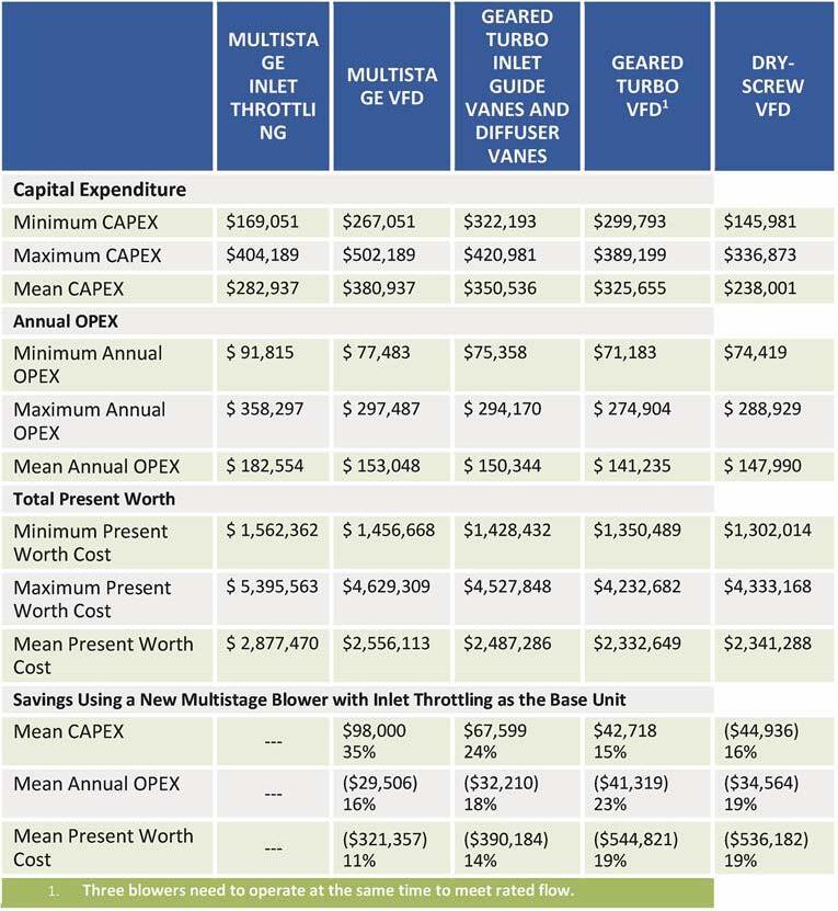 In contrast to the lower capital cost, and as expected, the power consumption from the multistage blowers with inlet throttling is the greatest of all the technologies, with an annual operating present worth of $91,815-$358,297, with a mean value of $182,554, or $1,836,300$7,165,940, with a mean value of $3,651,080 over a 20-year period. The most-efficient alternative was the integrally geared turbo with adjustable frequency drive (AFD), with an annual operating present worth of $71,183$274,904, with a mean value of $141,235, or $1,423,660-$5,498,080, with a mean value of $2,824,700 over a 20-year period, which represents a 22 to 24 percent (23 percent) savings (over a 20-year period) compared to the existing blowers.