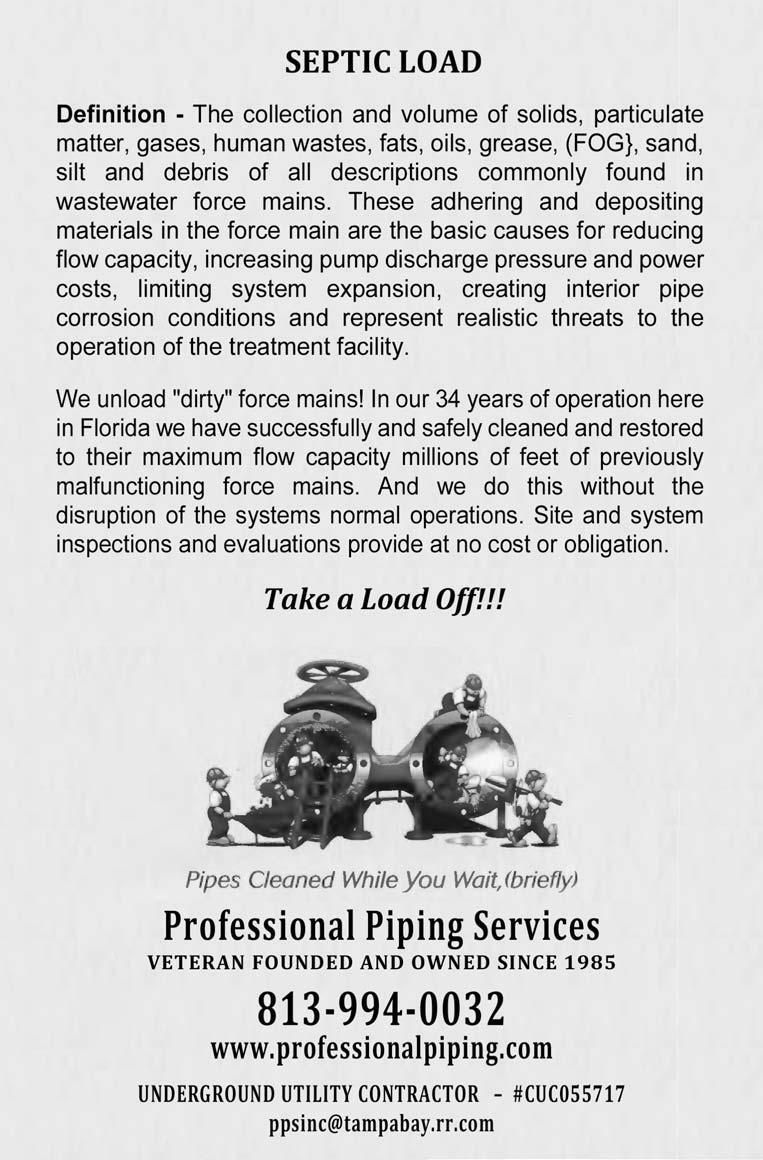 The Post Office will not forward your magazine. Do not count on getting the Journal unless you notify us directly of address changes by the 15th of the month preceding the month of issue. Please do not telephone address changes. Email changes to changes@fwrj.com, fax to 352-241-6007, or mail to Florida Water Resources Journal, 1402 Emerald Lakes Drive, Clermont, FL 34711