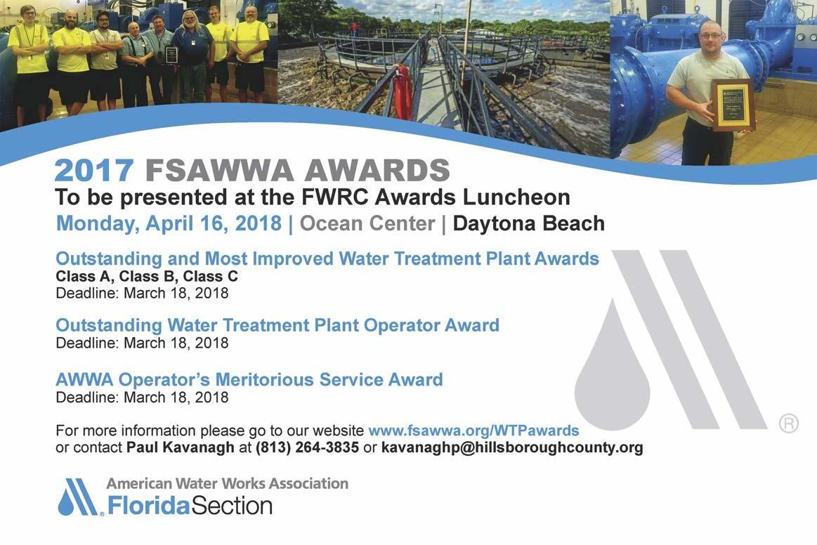 The Post Office will not forward your magazine. Do not count on getting the Journal unless you notify us directly of address changes by the 15th of the month preceding the month of issue. Please do not telephone address changes. Email changes to changes@fwrj.com, fax to 352-241-6007, or mail to Florida Water Resources Journal, 1402 Emerald Lakes Drive, Clermont, FL 34711