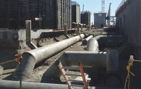As part of the physical material requirements for the appropriate FRP pipe design, specific loading conditions had to be considered for the underground pipelines. These pipes needed to be strong enough to handle the soil load from burial depths of up to 32 ft of cover, as well as AASHTO H-20 traffic loading. In addition, the pipe needed to be able to withstand the internal pressures of 118 pounds per sq in. gage (psig) and at the same time be able to handle negative pressure of 7.25 psi vacuum with the addition of 6 ft of groundwater pressure at the top of the pipe. In order to achieve the physical requirements for the underground piping, two different pipe stiffness classes were utilized (pipe stiffness of 36 and 46 psi), as