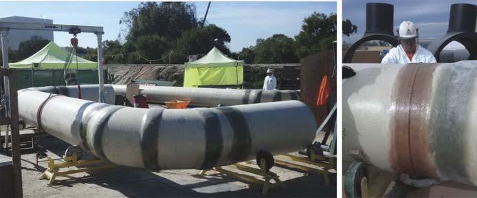 Once the products were delivered to the project site, the pipe manufacturer’s field representatives worked together with the contractor’s field staff to provide in-field solutions during the installation. To help with the speed of the pipe installation, precut glass kits were provided and labeled from the pipe manufacturing facility to the jobsite so that field crews did not have to cut glass in the field, which saved time on the fiberglass fieldlaminated joints.