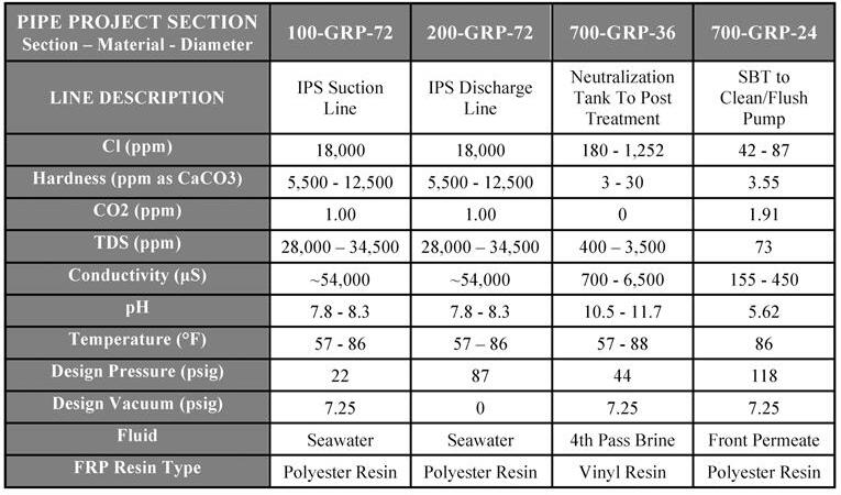 The FRP pipe was used in various sections throughout the facility. Each section within the facility had different requirements for the pipe material, as shown in Table 2a and 2b. The material used for the seawater intake pipe is exposed raw seawater, which is highly corrosive and has a salinity of approximately 4 percent. The FRP pipe materials utilized for the permeate water with chemical addition are exposed to various pH levels ranging from as low as 4.5 to as high as 11.7. Because of the various conditions within the system, the resin manufacturer provided both polyester and vinyl ester resin to accommodate the pipe section requirements.