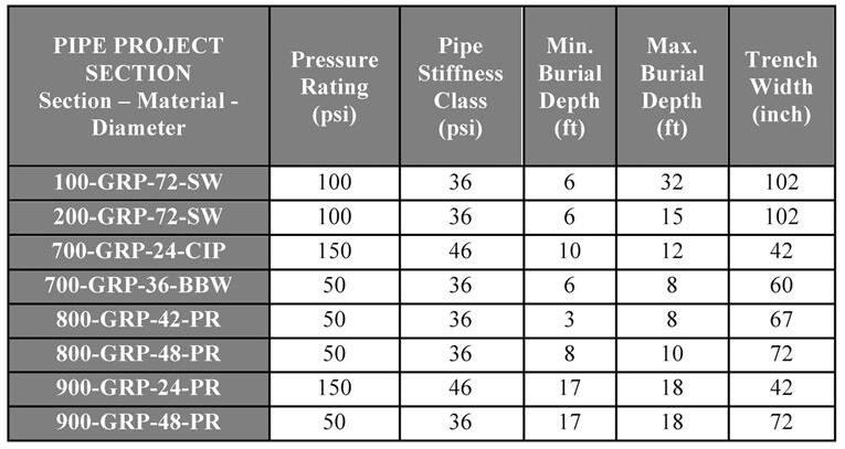As part of this project, the contractor had to install roughly 2,100 lin ft of underground filament wound fiberglass reinforced polymer (FRP) process to carry raw seawater and permeate product for the desalination plant. With a flow capacity up to 108 mgd of raw seawater and 54 mgd of desalinated permeate product through various processes, the diameters of the FRP pipes ranges from 24 to 72 in. The full scope of the FRP pipe installed for the underground sections is included in Table 1.