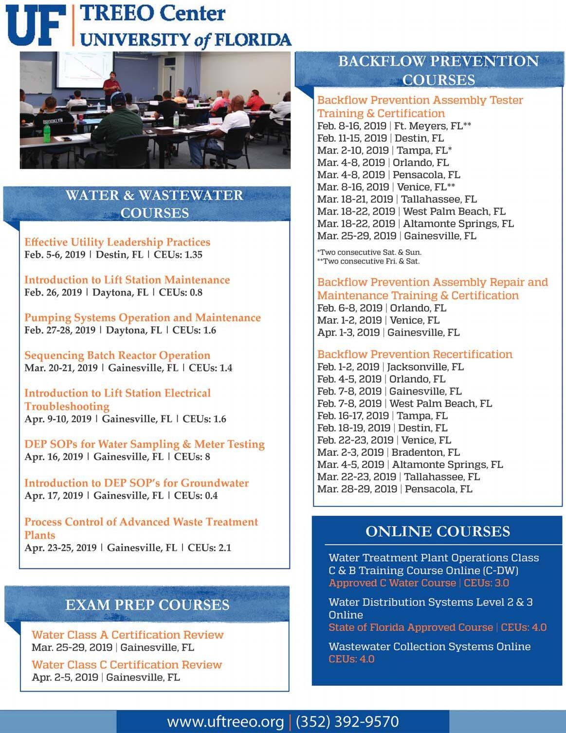 S The University of Florida TREEO Center also has a number of great classes to prepare you for a membrane plant. For example, a class on FDEP’s standard operating procedures (SOPs) for water sampling and meter testing, paired