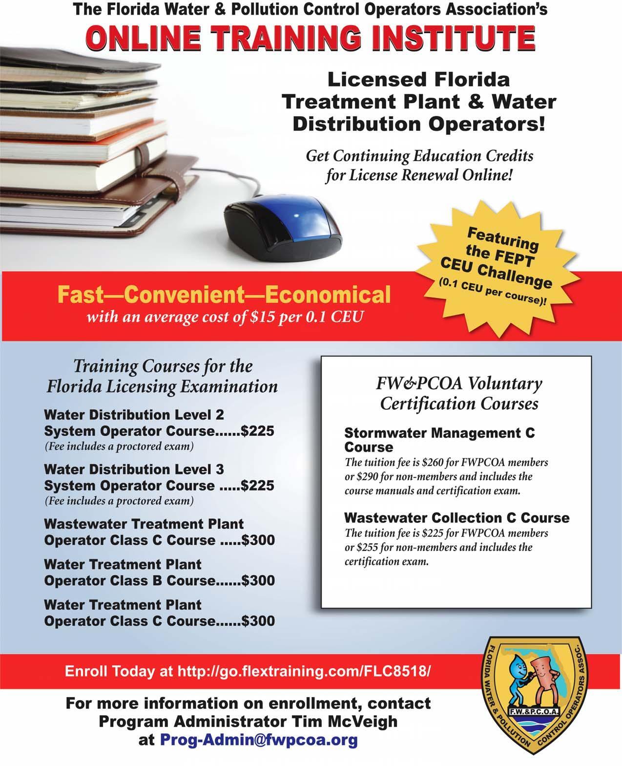 Always contact any school to determine its curriculum and ensure that you’re able and eligible to attend its classes or certification programs. Finally, get involved with organizations like the Florida Water and Pollution Control Operators Association (FWPCOA), Florida Section American Water Works Association (FSAWWA), Florida Water Environment Federation (FWEA), and the Florida Rural Water Association (FRWA). These organizations provide a variety of resources, classes, short schools, workshops, and conferences, and can answer your questions. Getting involved will help you be the best you can be and add value to you as an employee.