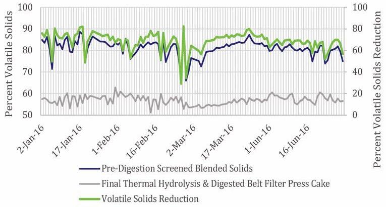 There are two digester groups, each with three 65-ft diameter digesters; each group has two primary digesters with fixed covers and one secondary digester with a floating cover. These gas holder covers permit a cover travel of about 6 ft, and thus provide up to 20,000 ft3 of biogas storage per secondary digester, with no other digester gas storage at the plant. The facility digesters receive an average of 86,000 gal of solids per day, with an average volatile solids concentration of 4.24 percent; this equates to an average of 30,000 lb/d of volatile solids fed into the digesters. On average, the volatile solids destruction for the SRWRF digesters was 15,800 lb/d, or 53 percent.