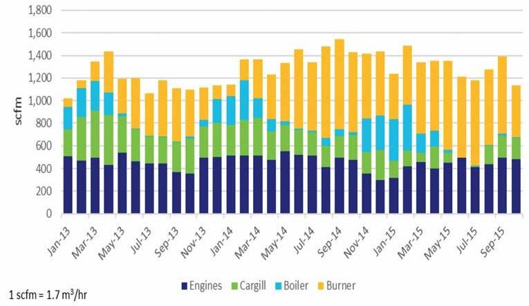 duced will be paralleled to the plant electrical grid. The power will be increased to 4,160V through the use of transformers and then paralleled using the existing Russ Electric switchgear. This electric power is used onsite, reducing the purchase of electric power that is produced using fossil fuels, and can generate an average of 455 kW of continuous electrical power, providing 20 percent of the required electrical power for the facility. To maximize the savings, the biogas generators are programmed to run at 100 percent capacity during the hours that FPL charges peak rates.