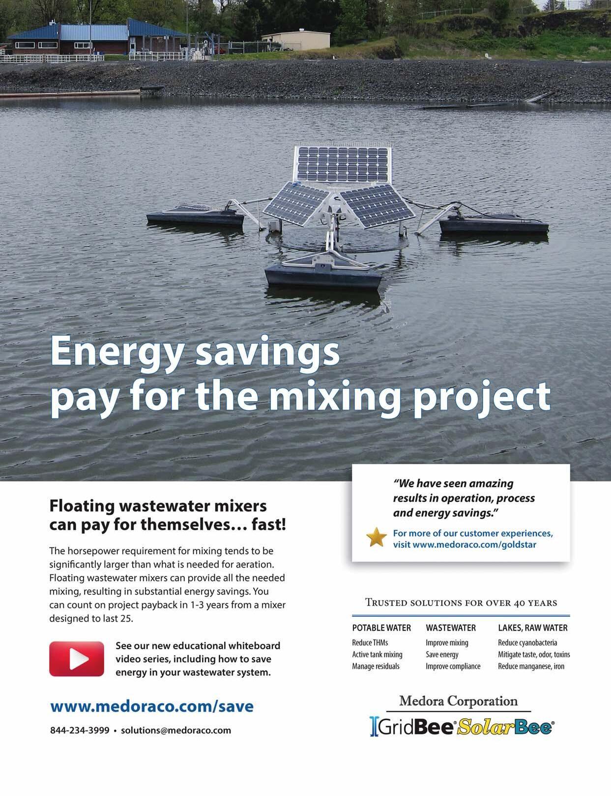 sory control and data acquisition (SCADA) system using Modbus communication protocol. The combiner panels connect to Solectria PVI 100-kW rectifiers, where the DC voltage is converted to 480-V, three-phase alternate current (AC) power, and the two rectifiers are then connected to the effluent pump building electrical gear. The effluent pump station has a base load energy usage greater than the solar power generation capacity. The electrical connection was made on the 480-V switchgear. Total yearly green energy production is estimated at 235,000 kWh, with an electrical savings of $20,000 per year. Adding solar power to the treatment facility is an environmentally sound business practice. It’s a relatively easy-to-implement project, in comparison with biogas-to-energy. Future expansion for the solar power may continue along the plant access roadway or mounted on the building roofs. There is ample space to expand the solar power from 162 to 500 kW when there are additional funding opportunities to further increase green energy and reduce the carbon footprint.