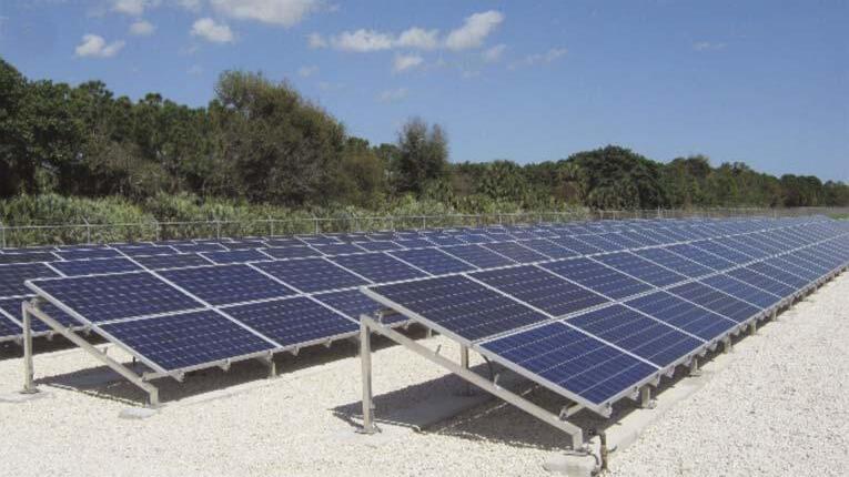 The installation of 162-kW groundmounted solar panels was completed in fall 2013. The project was partially funded through a green energy stimulus grant. The solar panels, in conjunction with the digester biogas project, now exceed the utility goal of 5 percent alternative energy. The SRWRF has large buffer areas, with both grassy lawn areas and a tree canopy. The Suniva MVX Series 250W solar panels were placed in the grassy area along the plant access roadway and are visible from the Florida Turnpike. The individual solar panels connect to combiner panels where the direct current (DC) voltage is monitored through the plant supervi-