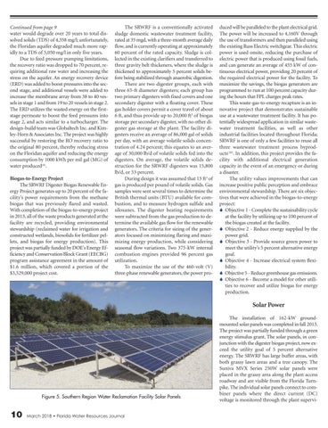 duced will be paralleled to the plant electrical grid. The power will be increased to 4,160V through the use of transformers and then paralleled using the existing Russ Electric switchgear. This electric power is used onsite, reducing the purchase of electric power that is produced using fossil fuels, and can generate an average of 455 kW of continuous electrical power, providing 20 percent of the required electrical power for the facility. To maximize the savings, the biogas generators are programmed to run at 100 percent capacity during the hours that FPL charges peak rates.