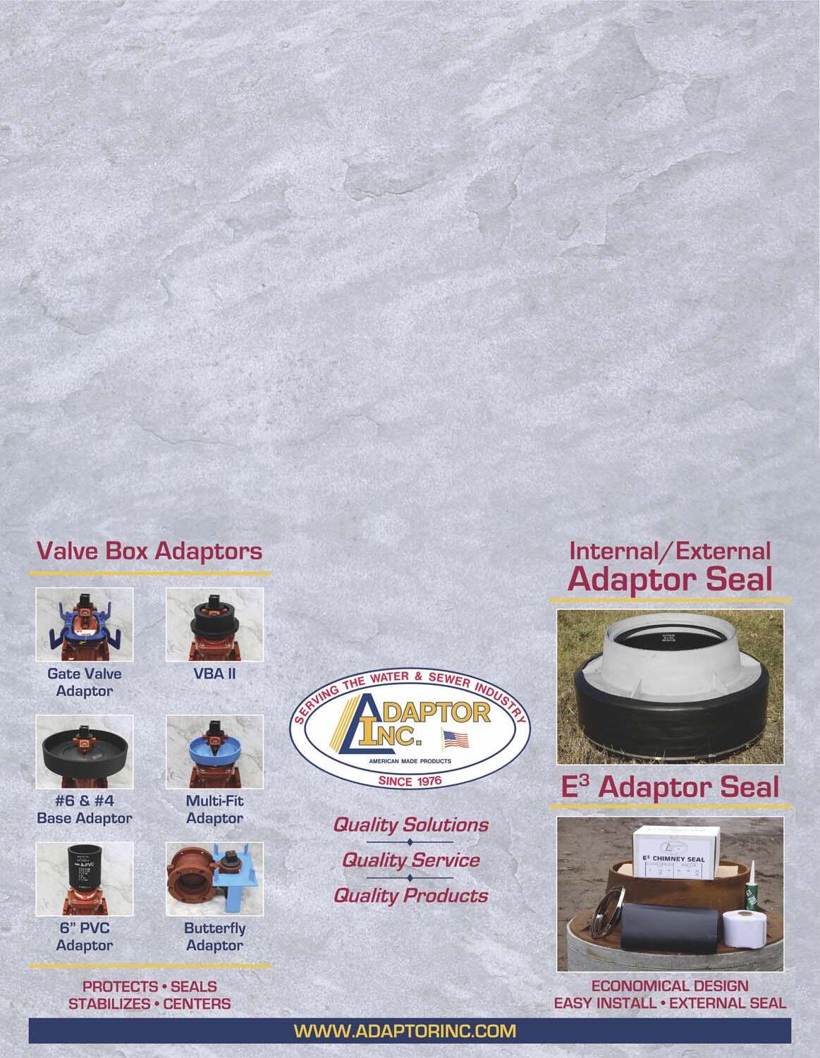 Adaptor Inc. has been manufacturing high-quality, American-made products for the water and sewer industry since 1976. The company was started by father and son, Stan and Michael Gagas. They were a water and sewer contractor at the time and were having to deal with the frequent problems of not being able to key a valve because of a shifted or settled valve box or the inflow and infiltration into the sanitary or storm manholes. This led to the development of the Adaptor Inc. product line.
