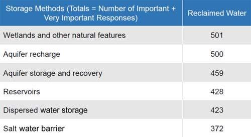 With regard to storage of reclaimed water, survey respondents identified natural storage systems (wetlands and aquifers) as the preferred storage alternatives, rather than man-made features, such as reservoirs (Table 5). This could be perceived as significant because it indicates a tendency for respondents to desire that reclaimed water be returned to the environment and could indicate a higher level of acceptance for IPR, thought that is just one interpretation. It’s worth noting that “salt water barrier” was identified as important or very important by less than 40 percent of respondents. There are several major efforts within the state to use reclaimed water to provide a saltwater barrier and it’s possible that this concept or the degree or potential degree of saltwater intrusion into coastal aquifers was not clearly understood by the respondents.