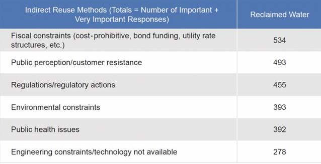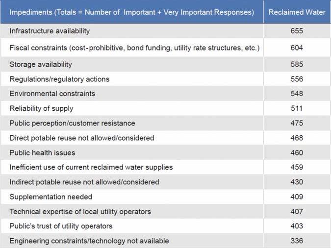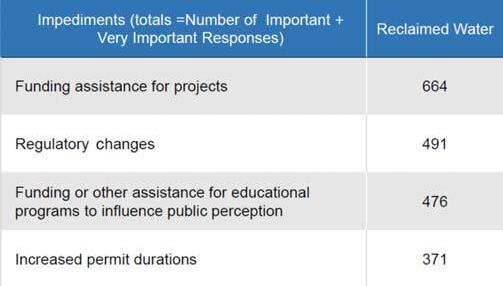 Table 3 summarizes the survey results relative to impediments to the expanded use of reclaimed water. Of particular note is that potable reuse, specifically whether indirect or direct potable reuse is allowed or considered, is listed