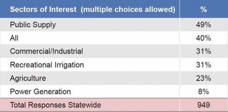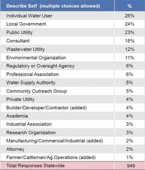 A total of 949 individuals responded to the online survey, as summarized in Table 1. Respondents were allowed to identify themselves by more than one descriptor (e.g., both an “individual water user” and a “consultant”), which