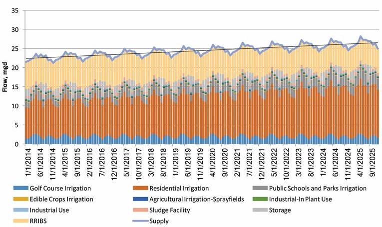 are not needed for irrigation and excess flows during wet weather periods. Water Conserv II is also the first reuse project in Florida permitted by FDEP to irrigate crops produced for human consumption with reclaimed water. The project’s reclaimed water meets FDEP’s public access reuse standards and is permitted for use on all public access sites, including residences and golf courses, food crops, foliage and landscape nurseries, tree farms, pasture land, and the production of soil cement, and can also be used for fire protection.