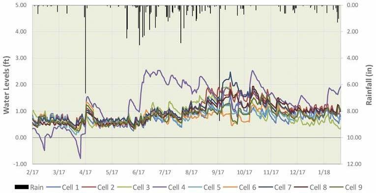and included two single-day rainfall events with totals of 6.7 and 8.8 in. The second of these occurred during Hurricane Irma, which passed over the site in September 2017. To further challenge operations, June 2017 saw nearly 17 in. of rainfall at the site, significantly raising wetland water levels. During 2017, the estimated direct rainfall contribution to the wetland was about 270 MG.