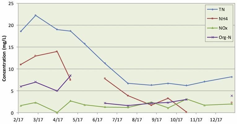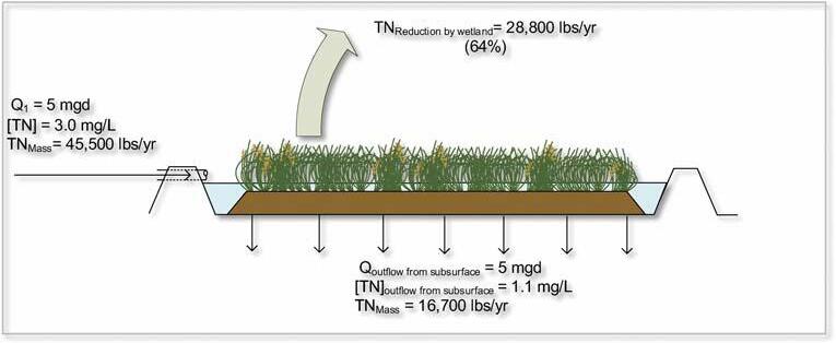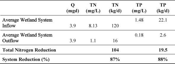 2017 and January 2018 has shown decreases in TN from an average of 12.2 mg/L in the inflow to less than 2.3 mg/L at the most hydrologically downstream stations, which is an 81 percent reduction. Furthermore, nitrate concentrations during this period have been reduced from an average of 1.8 mg/L to 0.02 mg/L at the most hydrologically downstream stations, a 99 percent reduction.