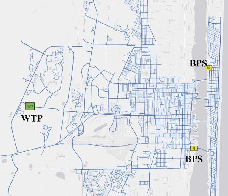 The City of Daytona Beach (city) has experienced challenges in maintaining an appropriate balance of its disinfection processes at the Brennan Water Treatment Plant (WTP) and two booster pump stations located in the potable water system. Figure 1 details the city’s existing water distribution system network. This situation results in periods when chloramine residuals, disinfection contact times, and compliance with disinfection byproducts (DBPs) regulations are difficult to maintain. In particular, the city experiences water quality challenges associated with low chlorine residual levels (less than 3 mg/L) during seasonal demand periods and in areas where system hydraulics and potable water demands result in older water. The city has noted that water quality complaints often occur from a single entity within a given area, oftentimes where the user is lo-
