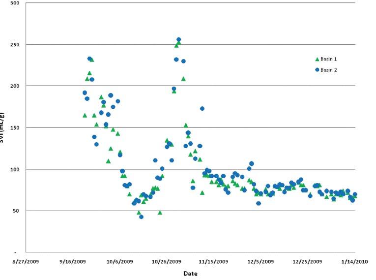 Figure 2 and Figure 3 show the solid loading rate to the secondary clarifiers and the sludge volume index (SVI) of the mixed liquor. The secondary clarifiers averaged 150 kg/m2-d (30 lb/d/ft2) during the snow melt periods with peak days reaching over 250 kg/m2-d (50 lb/d/ft2). The higher-than-normal solids loading rates can be attributed to the SVI values of below 100 mL/g observed during the test period (with the exception of the October 2009 foaming event).