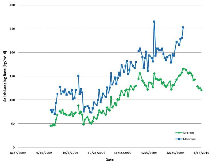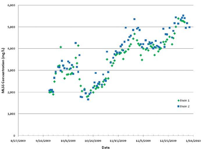 Figure 1 shows the increase in MLSS and solids loading rate to the secondary clarifiers during the pilot testing. The MLSS values (biomass only) increased from an initial value of 2,000 mg/L up to over 5,000 mg/L. A large amount of foaming was experienced in October of 2009. Plant operations staff were required to waste a large amount of solids from the system and interim foam removal measures were taken.