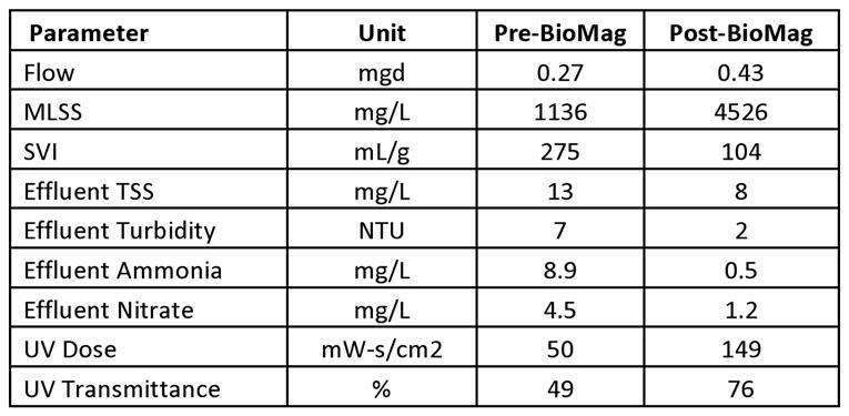 Prior to the facility upgrades, flow was diverted from the WPCF to a neighboring facility. The increase in flow after start-up was a result of ending the flow diversion. The MLSS concentration increased roughly 400 percent after implementation of the treatment process, which allowed for more biomass inventory and increased removals of ammonia and nitrate in the effluent. The increased flow and solids loading to the secondary clarifiers did not cause a deterioration in effluent TSS and turbidity due to the low SVI (even though the full-scale pilot had SVIs even lower). Ultraviolet (UV) transmit-