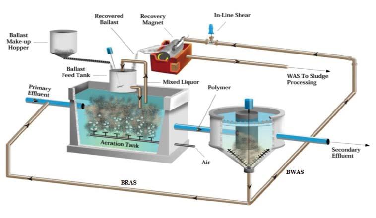 The process provides a magnetite ballast to bioreactors for dramatically enhanced settling of biological and chemical flocs. Magnetite is an iron oxide powder with a high specific gravity that adsorbs to solids to enhance secondary clarification. This allows for the secondary treatment process to operate at mixed liquor suspended solids (MLSS) concentrations much higher than conventional activated sludge systems due to the enhanced setting rate of the magnetite-impregnated mixed liquor. Magnetite is recycled from the clarifiers back to the suspended growth process in the return activated sludge (RAS). The waste activated sludge (WAS) is processed for magnetite recovery using an in-line shearing mechanism to separate the sludge from the magnetite, followed by a magnetic drum. Recovered magnetite from the WAS is returned to the bioreactors for reuse.