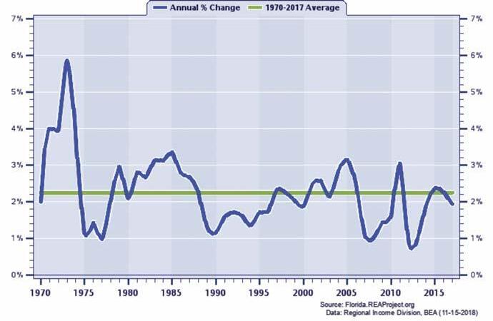 To meet anticipated demands for new water and wastewater service, the PUD’s planning department continuously reviews population and growth projections to plan for new infrastructure and treatment facilities. Planning, however, comes with challenges. Economic variability can make predicting the size and timing for new utility infrastructure difficult. Table 1 presents the population growth and projected growth data from the county’s 2018 Annual Economic Development Indicators Report, which shows a 15.09 percent growth rate between the years 2010-2018. In comparison, the county’s 2015 Annual Economic Development Indicators Report showed a much lower 6.43 percent growth rate. To further illustrate the long-term variability of the county's population growth, Figure 2 presents the year-toyear percent change from 1970-2017. The average annual percent change for the overall 48-year period is also illustrated in this figure to provide a benchmark for gauging periods of relatively
