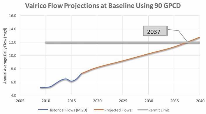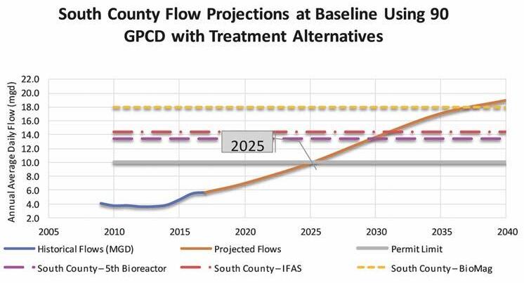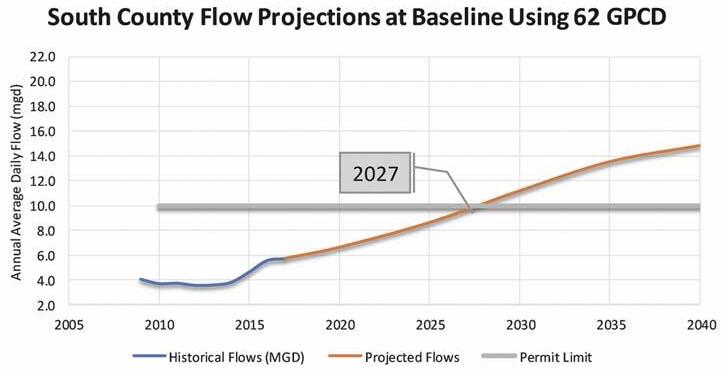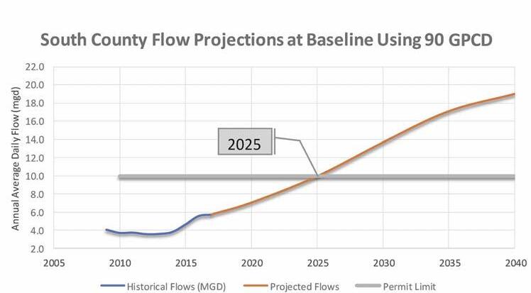 Figure 5. South County advanced wastewater treatment plant flow projections and permitted capacity at 90 gpcd.