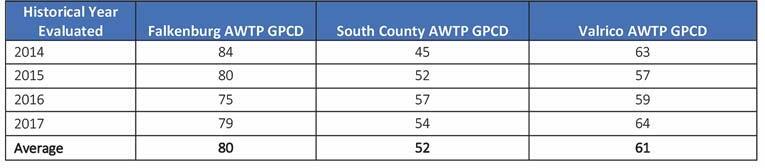The historical population and annual average influent flow data for each AWTP service area were provided by the county for the years 2014 through 2017. A historical look back was conducted to calculate the actual gpcd per year at each AWTP, with results presented in Table 2. The calculated gpcd results are all lower than the 90-gpcd value utilized during for planning purposes. The highest differences were noted for the South County AWTP and the Valrico AWTP service areas, showing reductions of 38 gpcd (9052) and 29 gpcd (90-61) respectively.