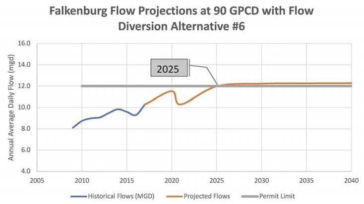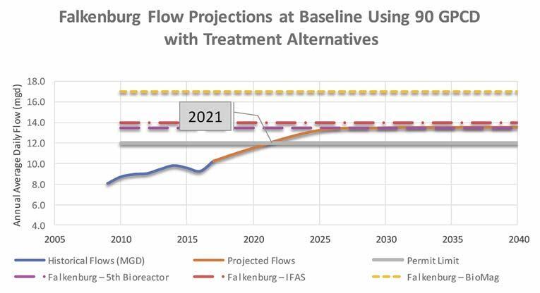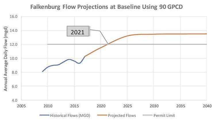 Figure 4. Falkenburg advanced wastewater treatment plant flow projections and permitted capacity at 90 gpcd.