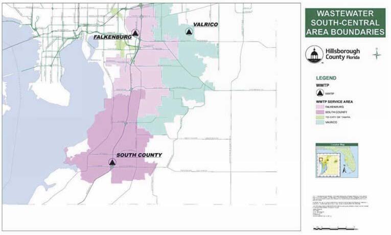 Figure 3. Location and service areas for South County, Falkenberg, and Valrico advanced wastewater treatment plants.
