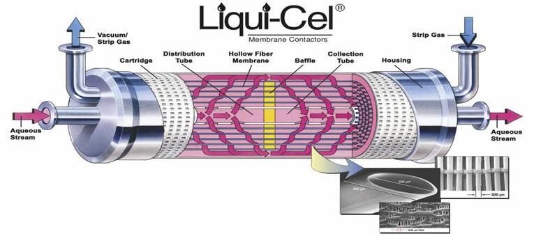 Membranes have recently been piloted for removal of THMs and are specifically designed to separate the gas from the liquid phase; the membrane permits the flow of air/gases through the media, while preventing water from passing through. Figure 3 presents a depiction of the liquid and air flow through the membrane module and an overall process schematic.