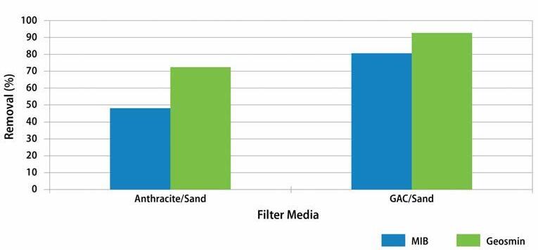 The GAC removes THMs and HAAs through adsorption onto the carbon media and has the advantage of removing both the THMs and the organic material in the water that reacts with chlorine to create THMs. The GAC also removes the chorine residual and could be operated as a seasonal solution to the THM issue. The usual operation is 10 minutes of empty bed contact time based on the flow rate; typically, 10,000-bed volumes are achieved before breakthrough. Research has shown that more than 80 percent of THMs were removed by GAC through a media life of 10,000-bed volumes at a 10-minute empty bed contact time (i.e., 22 liters of water treated per gram of GAC). If GAC is selected for implementation, rapid small-scale column tests on the distribution system water should be conducted to determine the actual carbon usage rates for the system.