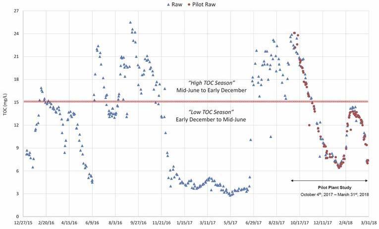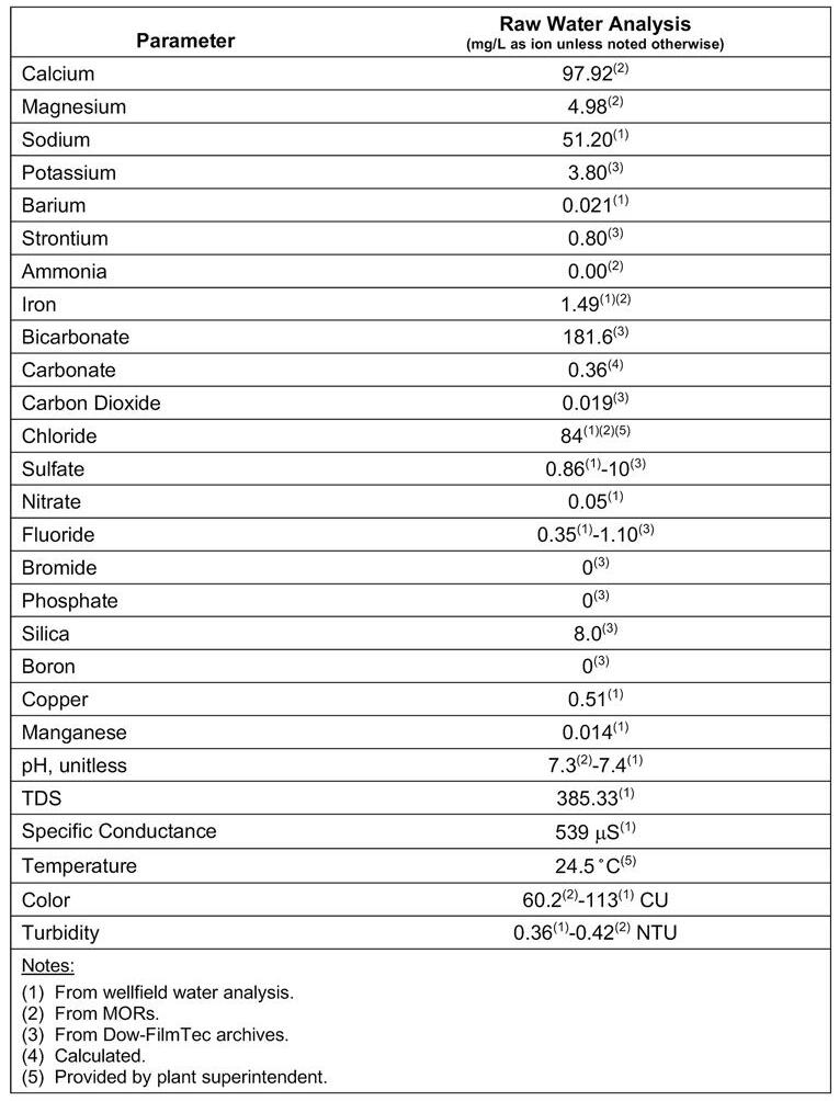 mg/L as calcium carbonate, which is considered “very hard” for human use and consumption. The total organic content of the water is also considered very high, averaging approximately 18 mg/L. It’s this organic content that results in the color level, which exceeds secondary standards. The NF process was chosen for the effective removal of both the hardness and organics. The other parameter not meeting standards in the raw water is iron, and although the NF process effectively removes iron to a level below the regulatory standard, it remains a concern to operations staff due to its potential to stain at levels well below the maximum contaminant level (MCL). Because of this concern, the proposed replacement membranes were evaluated to remove iron to levels below that currently being achieved. Table 1 summarizes the raw water quality from both the Arena and Flamingo park wellfields, which represent the source water to the WTP.