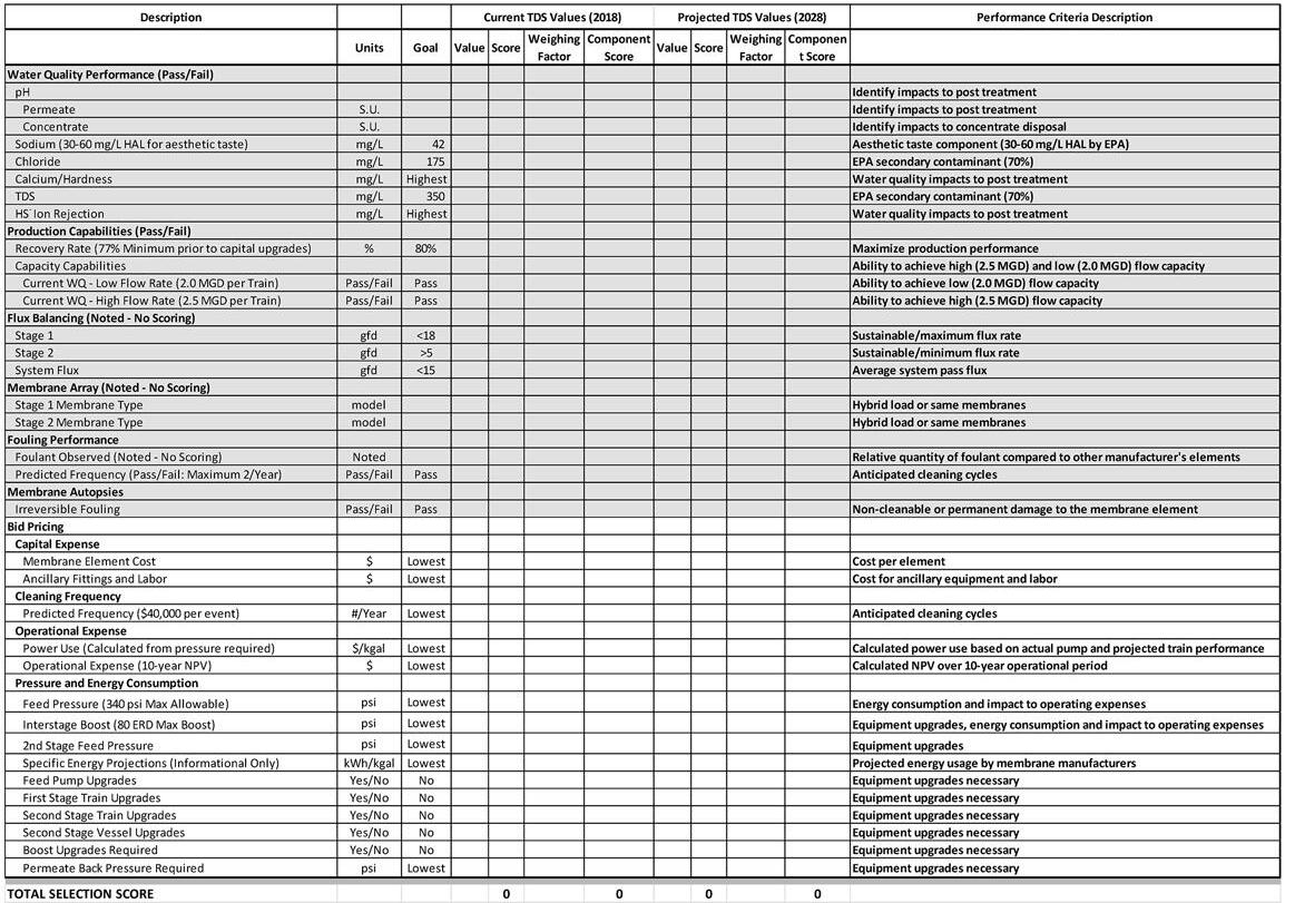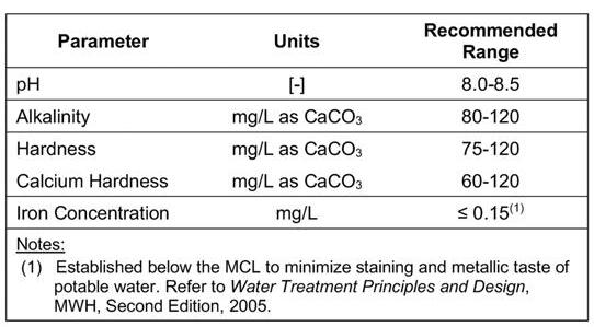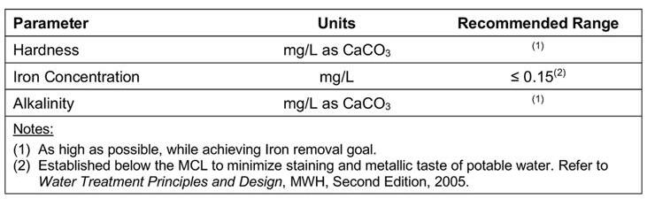 The finished water goals were further refined from the membrane element replacement evaluation in terms of alkalinity, hardness, and iron. The values identified were consistent with recommendations by industry-recognized sources, such as the American Water Works Association (AWWA) and the Water Research Foundation. The goals that were set are summarized in Table 3.