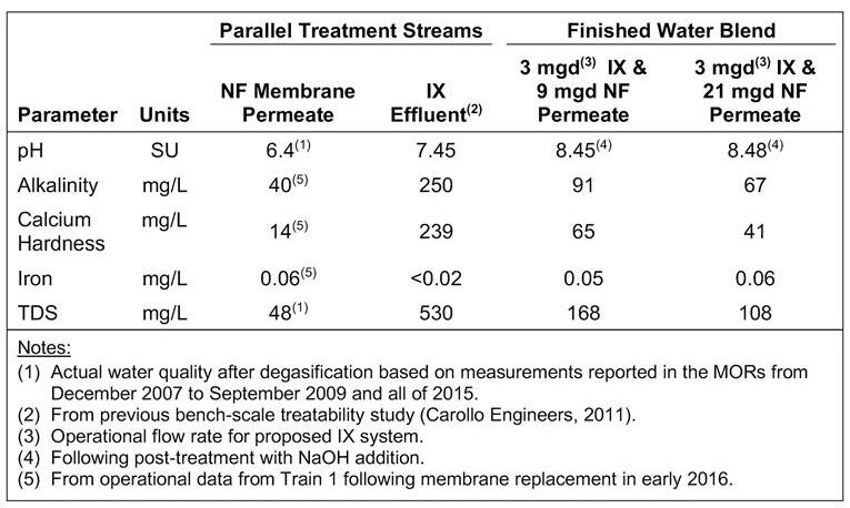 During the design process for Phase I, the capacity of the system was optimized, and updated blended water projections were performed. Based on maximizing the availability of existing treatment systems, the capacity for Phase I was increased to 3 mgd. Table 5 summarizes the updated water blend characteristics. These projects compared the 3-mgd IX system to the amount of NF treatment to achieve the average treated water flow, as well as the total rated plant capacity flow rate.