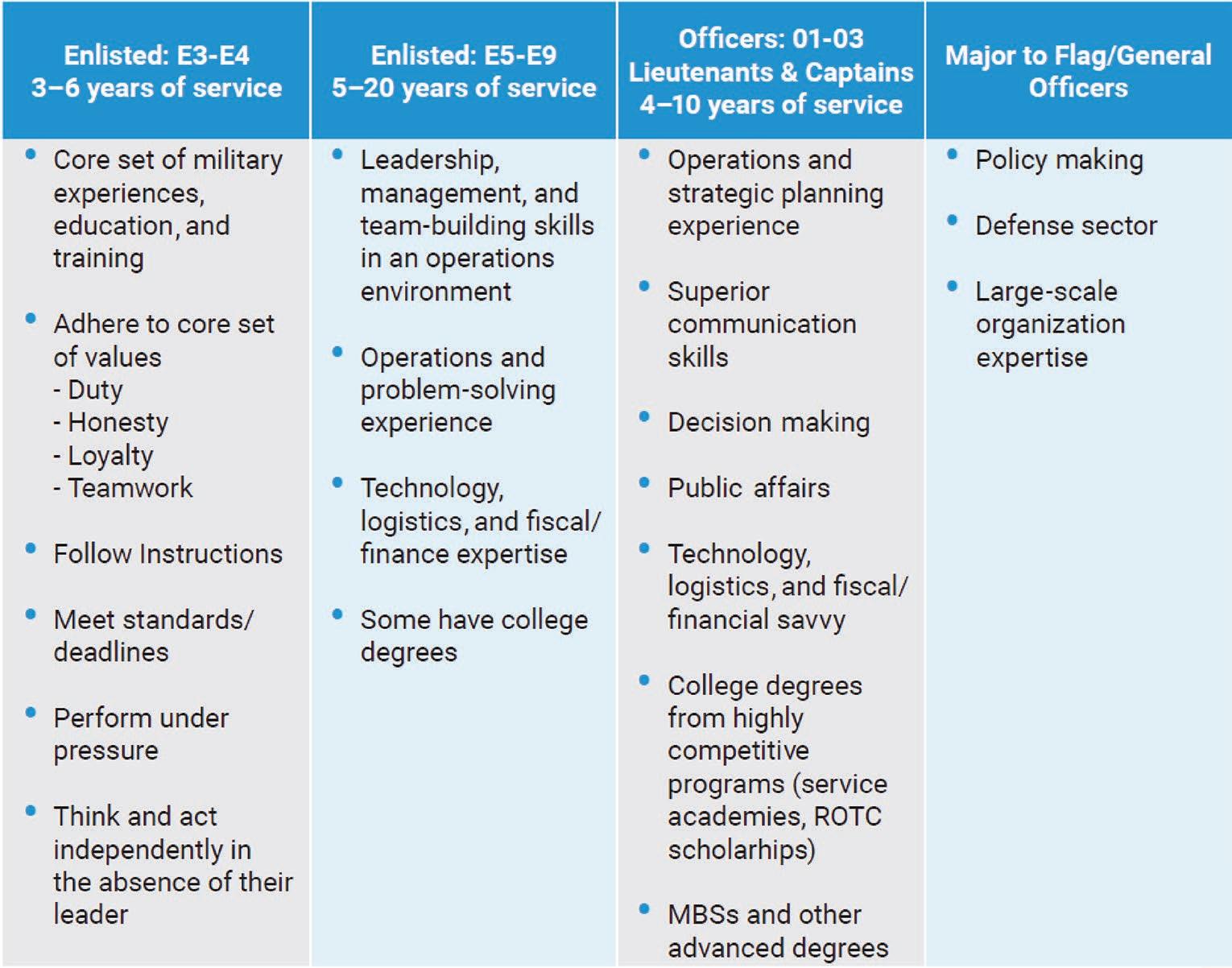 Below are general skill sets, experience, and education for different military populations.
