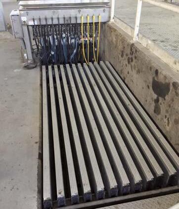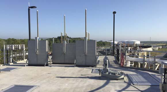 with a headworks facility that includes influent screening and grit removal. As previously mentioned, the headworks at the facility are newly improved to facilitate the capture of more inorganic solids. The new structure has two mechanical bar screens, coupled with washer compactors and a manual bar screen as a bypass. It also uses two cyclone degritters. Odor control is accomplished through a biological treatment unit.