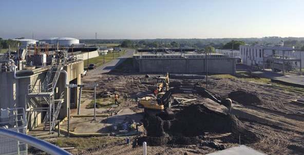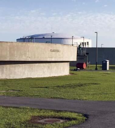 The facility is an extended aeration plant, with an anaerobic zone before the aeration tank. The biological treatment includes four treatment trains with anaerobic selector tanks, followed by oxidation ditches. This treatment process provides the ability to simultaneously nitrify and denitrify in the oxidation ditches that discharge into six circular clarifiers, followed by eight deep-bed sand filters.