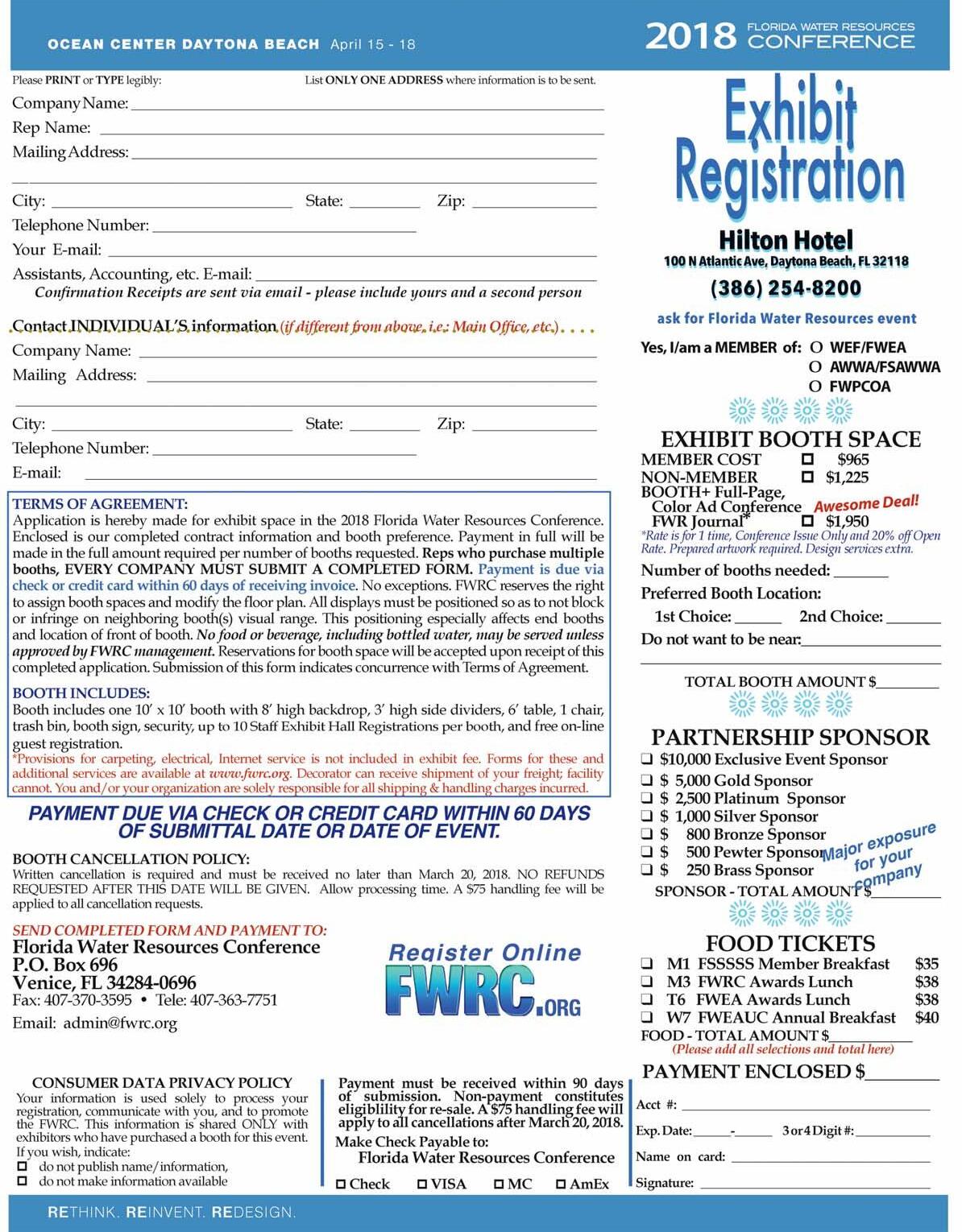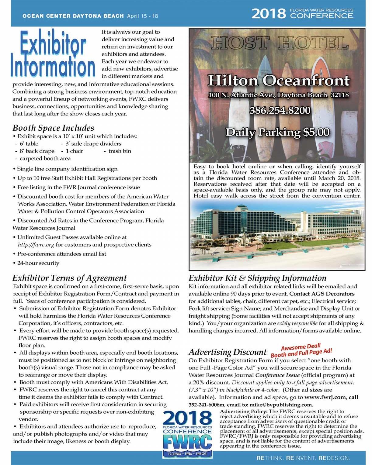 A joint conference of Florida’s three major water industry organizations: Florida Section American Water Works Association, Florida Water and Pollution Control Operators Association, and Florida Water Environment Association (Florida chapter of the Water Environment Federation), the FWRC is scheduled for April 15-18, 2018, at the Ocean Center in Daytona Beach. The conference, with a technical program, exhibits, awards luncheon, meetings, contests and competitions, and other