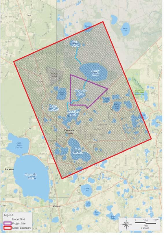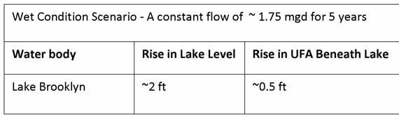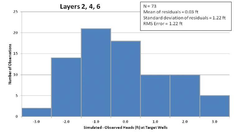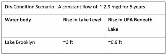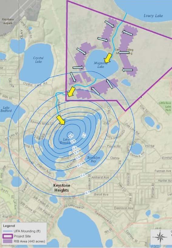 Groundwater modeling, including a MODFLOW groundwater flow and associated MODPATH particle tracking model, was performed during the feasibility study and subsequently updated using data collected from on-site testing. The flow model was used to evaluate the reduction in drawdown from the city’s supply well field. Model results indicated that recharge of 3 mgd will reduce drawdown in the City of Clearwater’s well field by 1 ft in the northern portion of the well field, and a few tenths of a ft in the southern