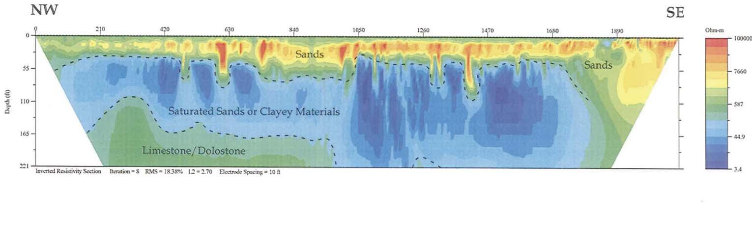 The geology of the area consists in general of a layer of unconsolidated sand, silt, and clayey sand, underlain by a sandy clay-to-clay layer. The clay layer is underlain by a limestone sequence comprised of, in descending order, the