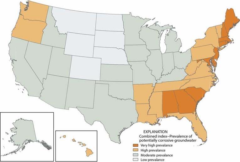 Two indicators of potential corrosivity were combined to determine that corrosive groundwater occurs in all 50 states and the District of Columbia. Corrosive groundwater, if untreated, can dissolve lead and other metals from pipes and plumbing fixtures.