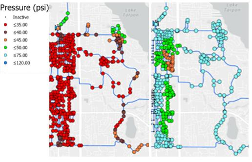 The county’s RCW transmission and distribution system illustrates the challenges faced by public access reuse networks. Serving over 6,300 active customers through two pumping stations and approximately 177 mi of pipeline, the system experienced significant pressure drops and supply constraints during peak irrigation periods. These conditions, accompanied by customer noncompliance with watering restrictions, resulted in overirrigation in portions of the system and insufficient pressure in other portions. Such inequality in RCW supply throughout the system can undermine the conservation potential of the system and highlight the need for smart data-driven management strategies. Historically, many RCW models have been constructed using demand-driven approaches that assume usage at specific points in the network is independent of pressure. These approaches; however, are known to overestimate system performance after improvements because they fail to Continued on page 10