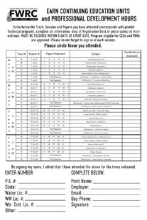 Look for the CEU/PDH card at the technical sessions and workshops. You are responsible for completing and returning the card to be awarded units. Circle the paper in the track/session that you attend and complete information at the bottom of the card. Room monitors will have sign-in sheets that they circulate; please sign in as well. Cards should be turned into the registration desk, or stamp and mail to the address on the backside. Cards must be received no later than five days from the conclusion of the conference on May 2nd. At that time, certificates will be mailed and a report sent to the state. FWRC Course Number: 05131007