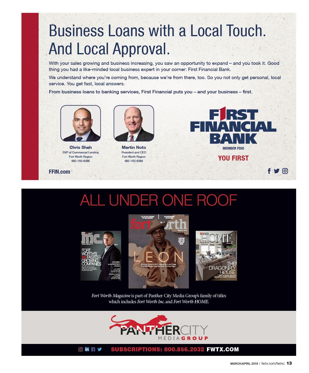 Send address changes to Fort Worth Magazine, 6777 Camp Bowie Blvd, Suite 130, Fort Worth, TX 76116. Volume 5, Number 2, March/ April 2019. Basic Subscription price: $19.95 per year. Single copy price: $6.99 ©2019 Panther City Media Group.