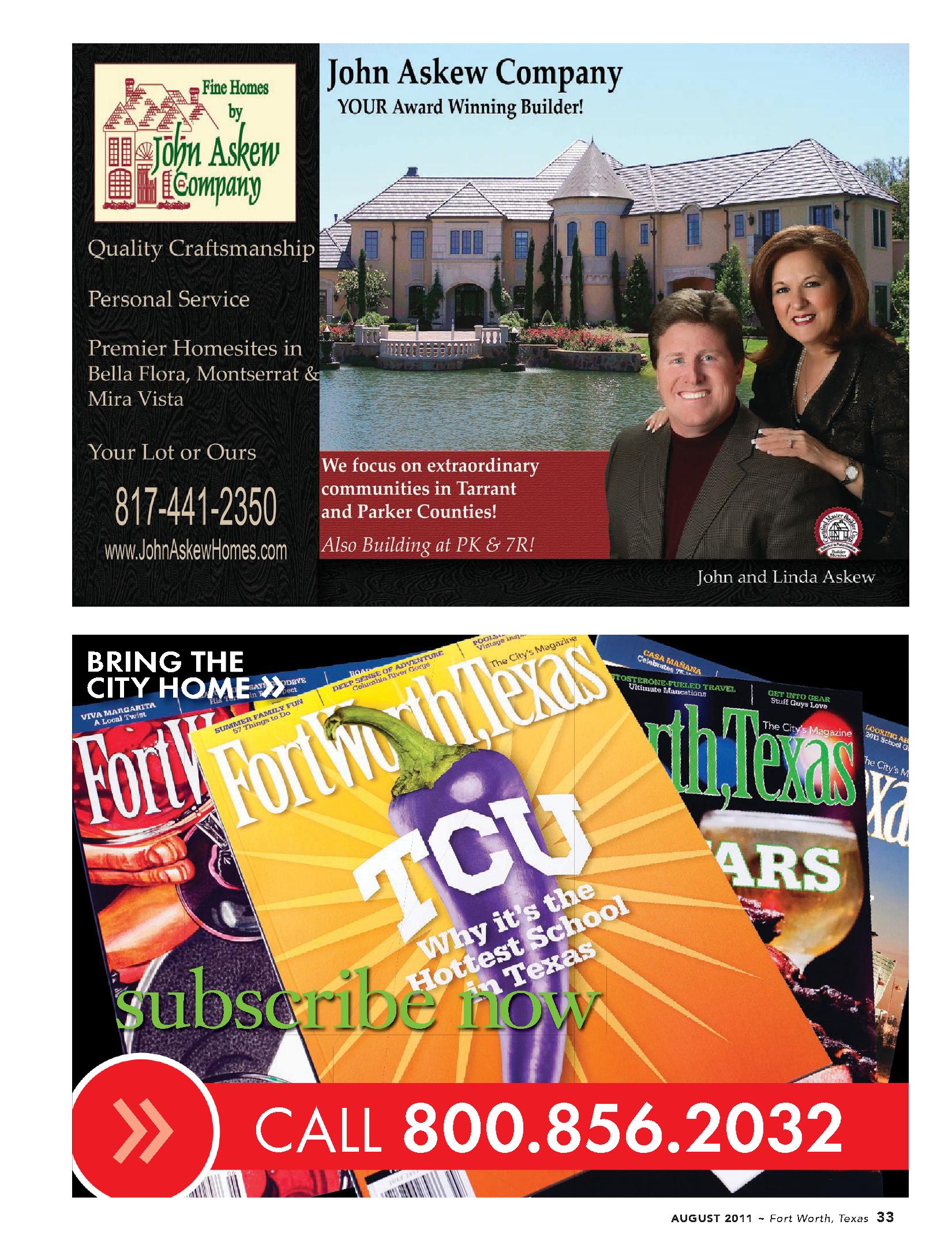 To subscribe to fort worth, texas magazine, or to ask questions regarding your subscription, call 800.856.2032.